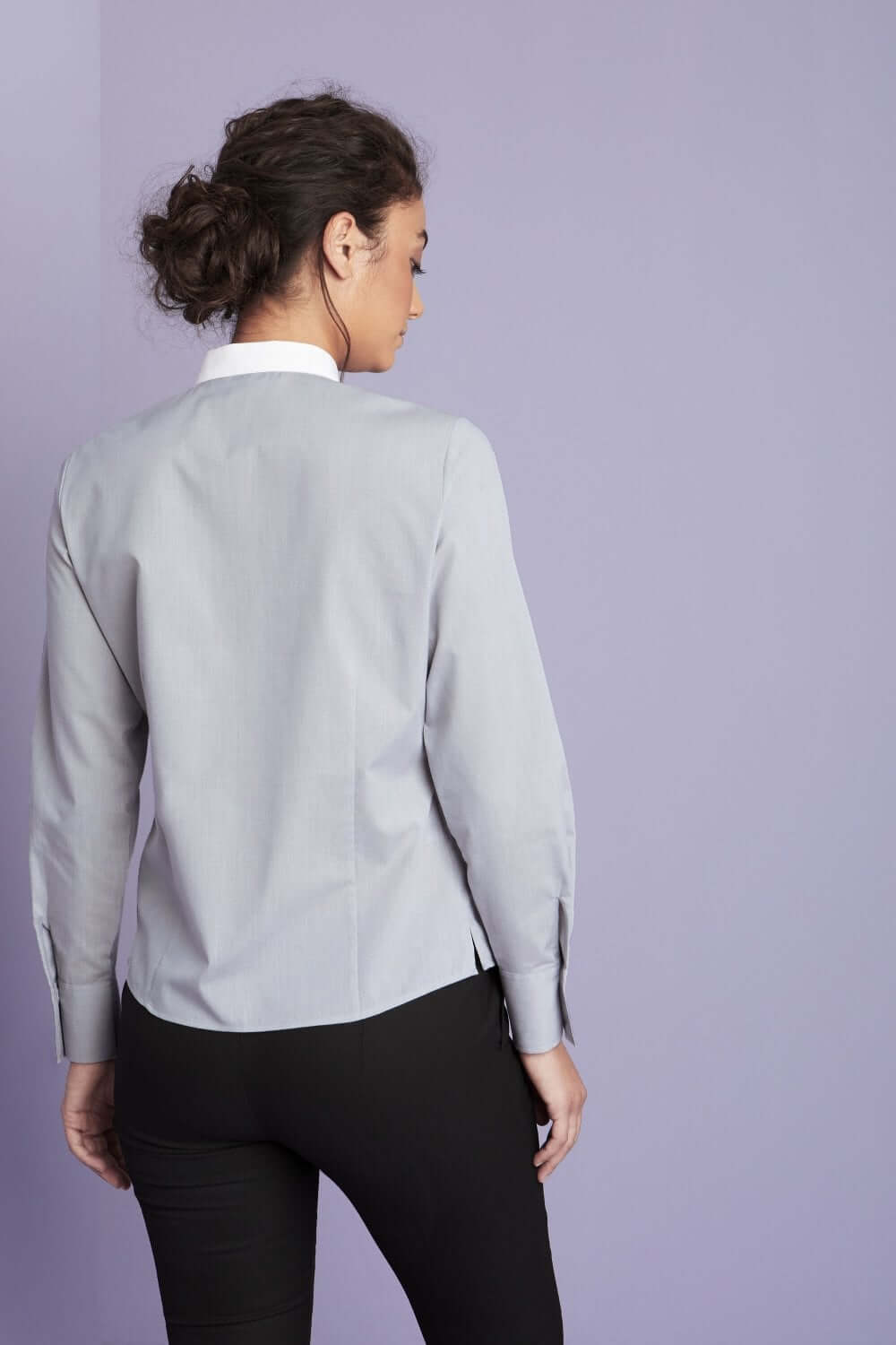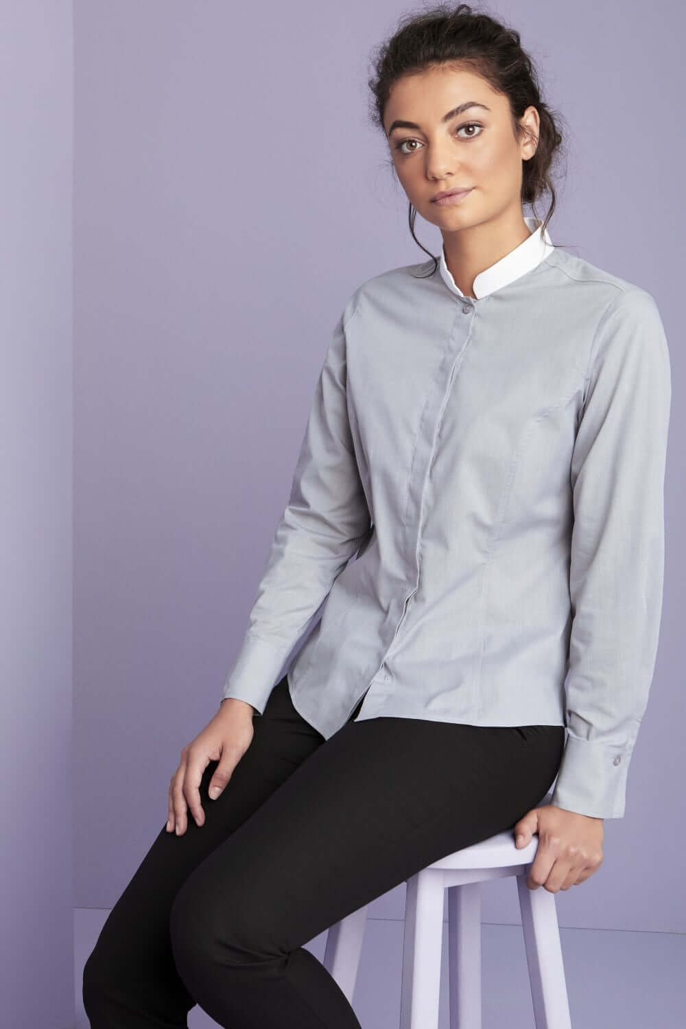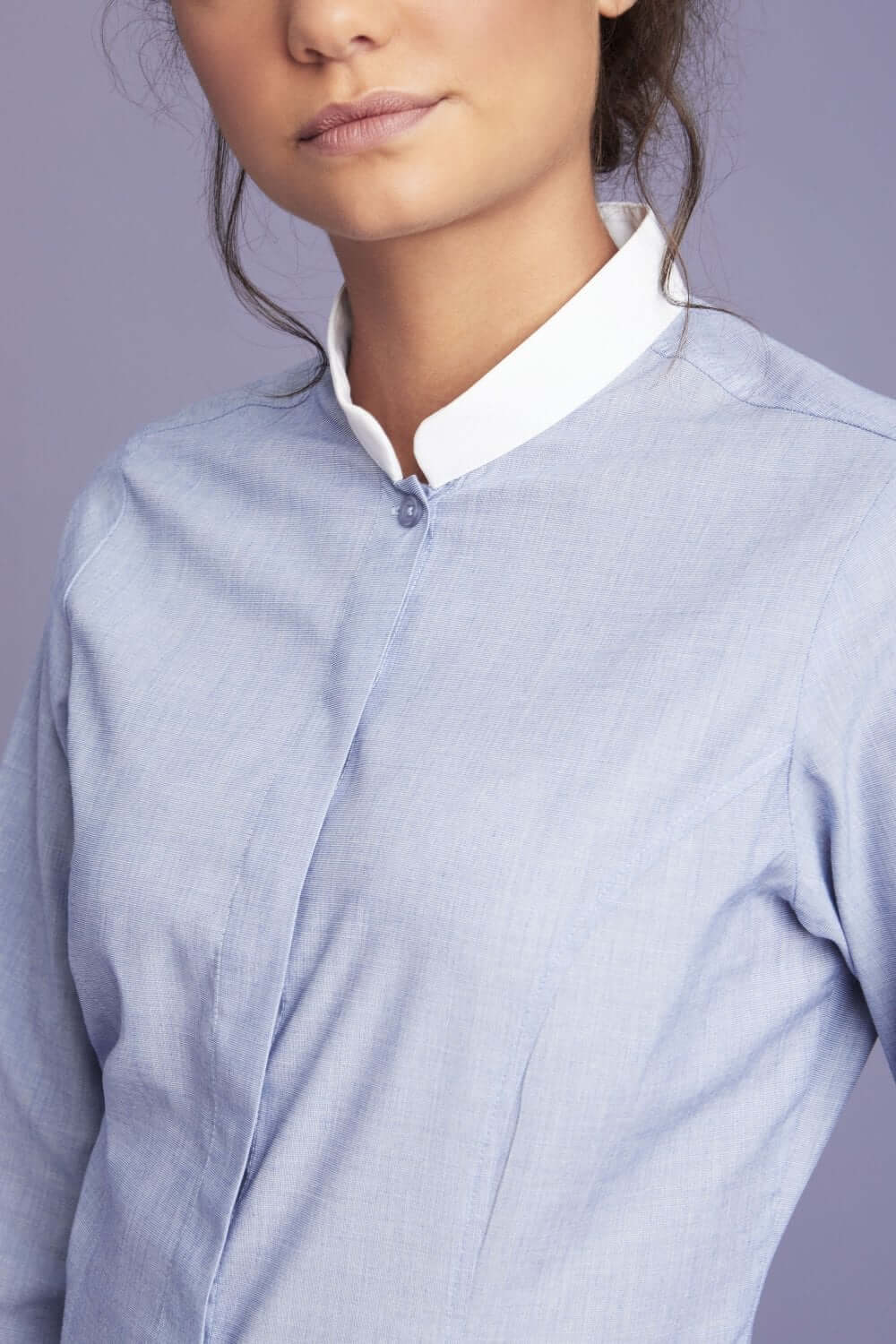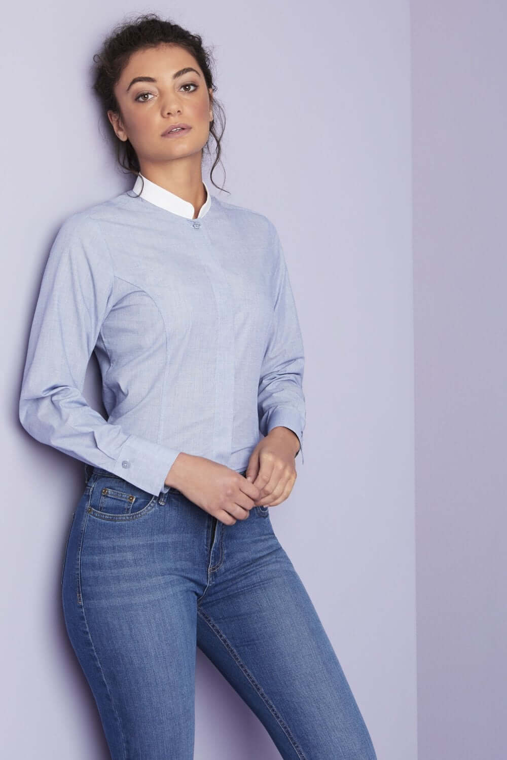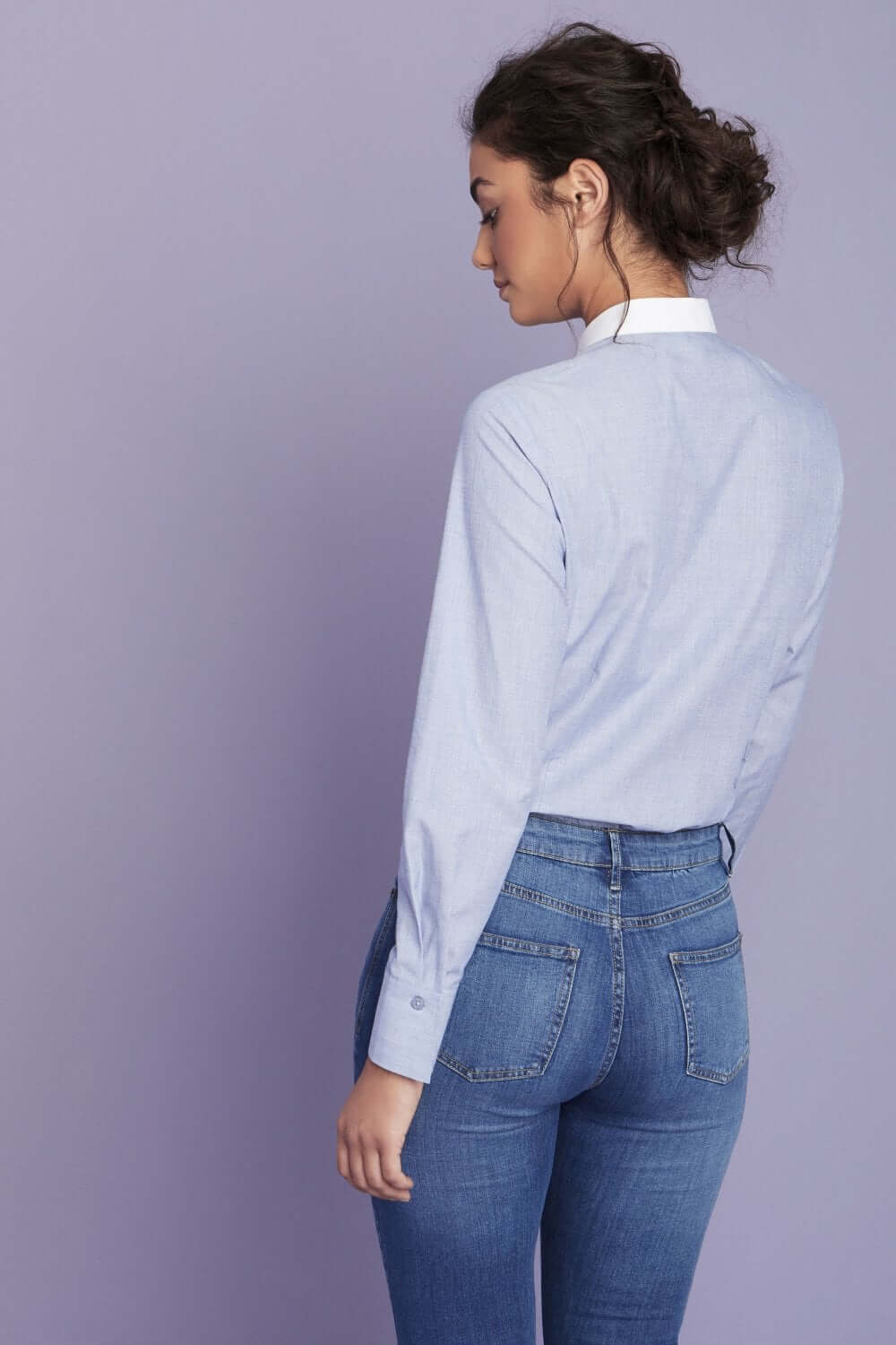 Women’s long-sleeved jeans-style blouse with contrasting neckline. Very comfortable and air-permeable fabric.