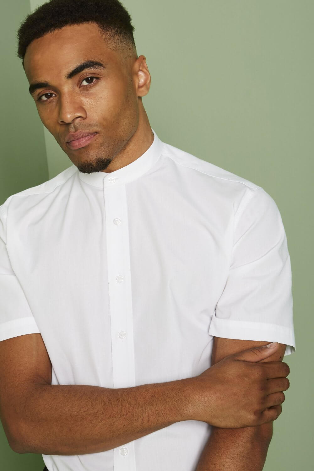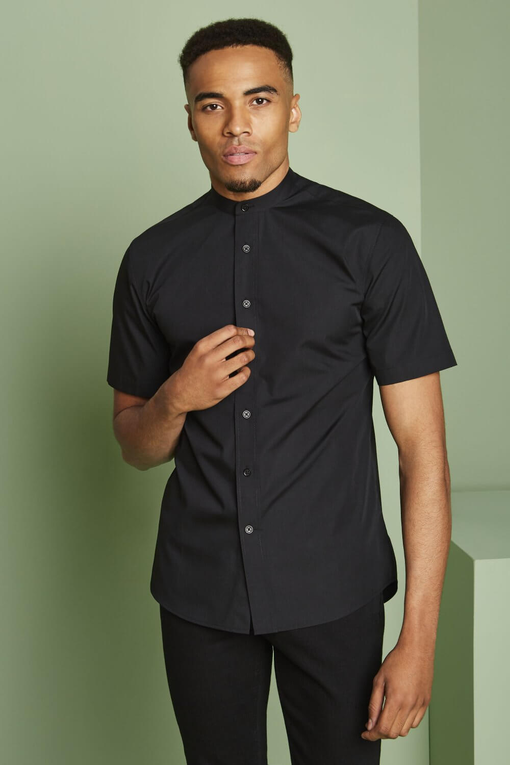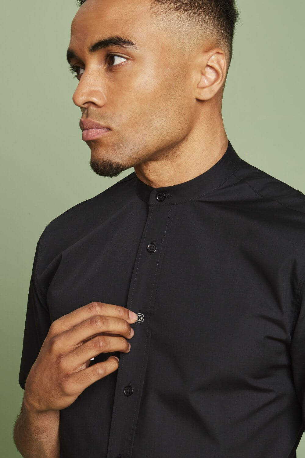 Lühikeste varrukatega, mandarin kraega, eest nööbitav pluus.