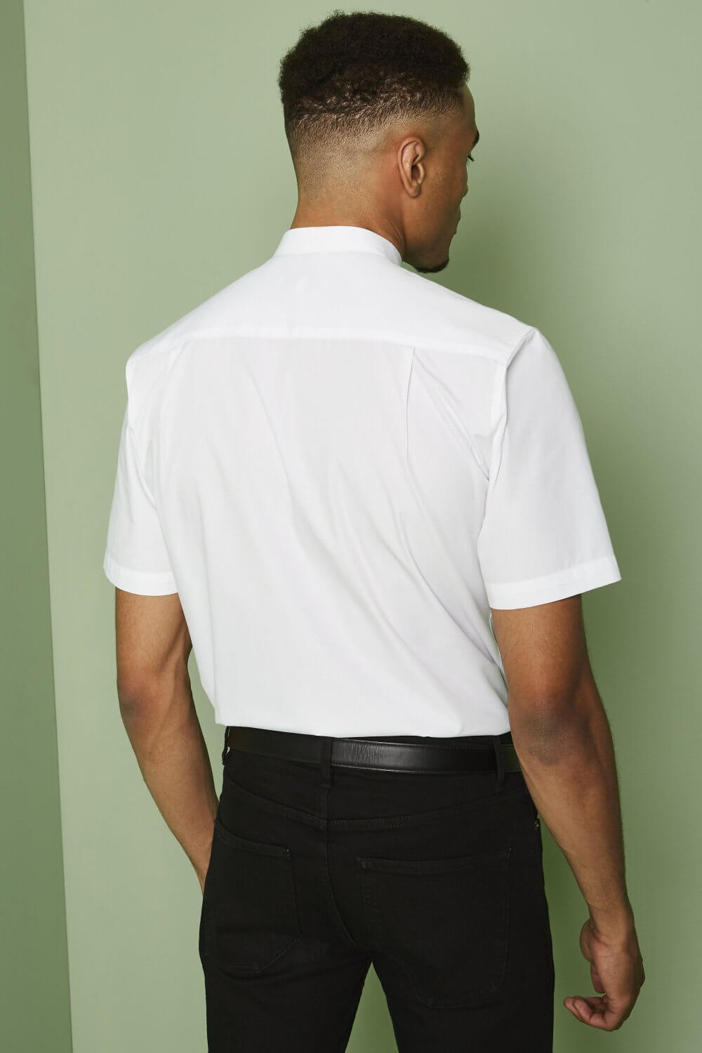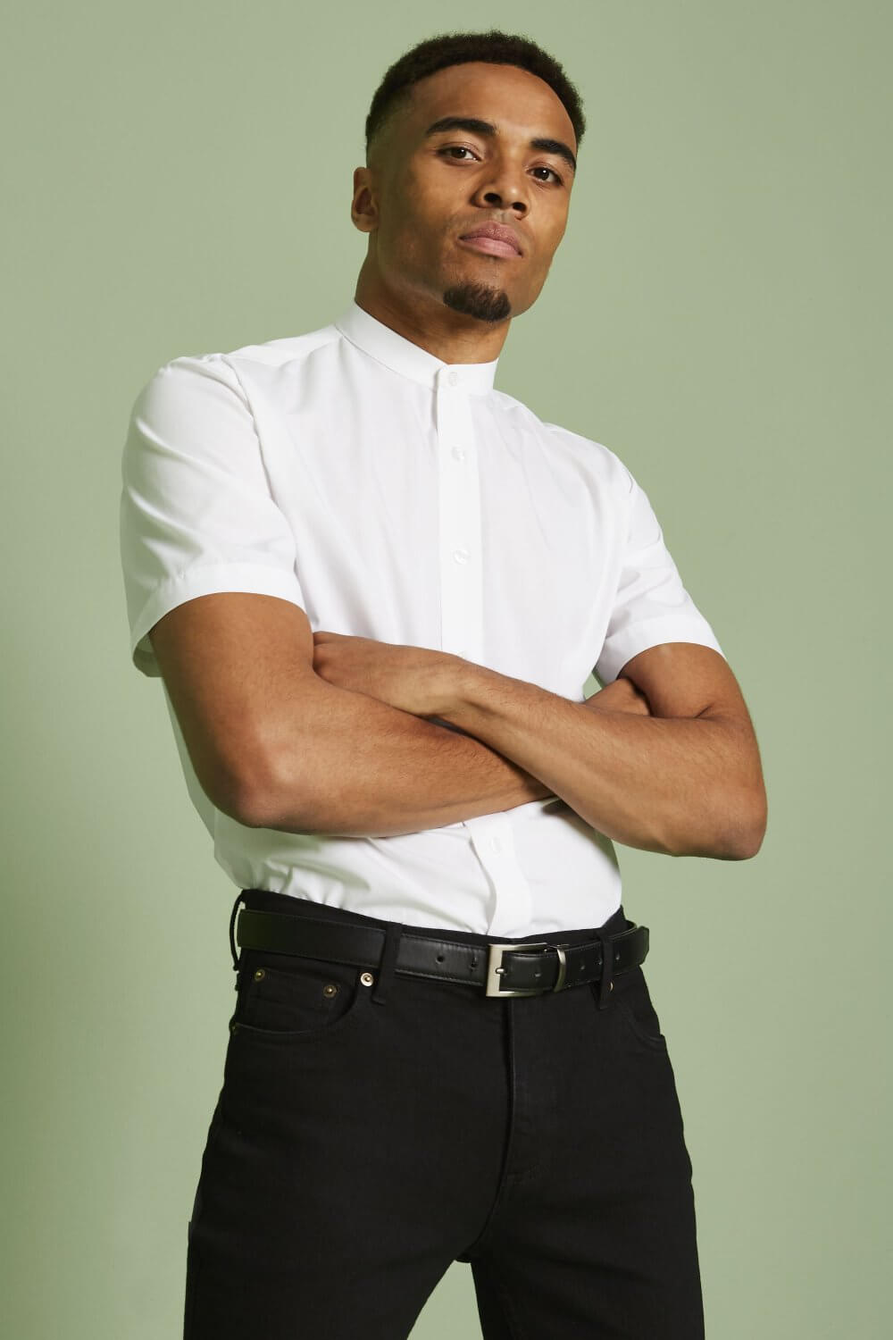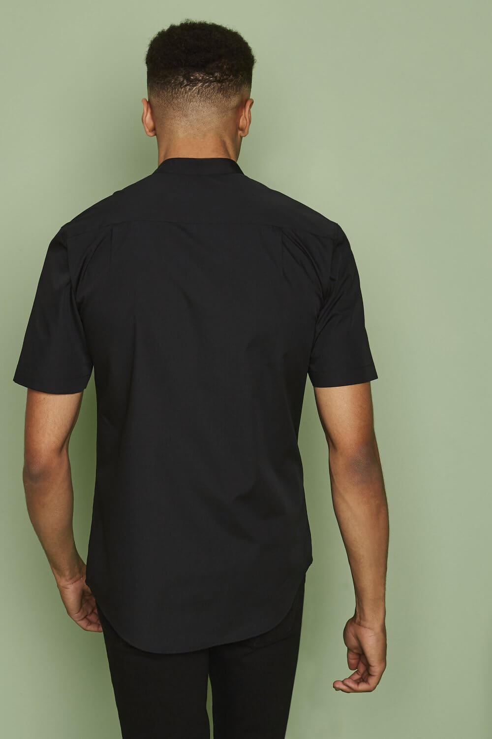 Lühikeste varrukatega, mandarin kraega, eest nööbitav pluus.