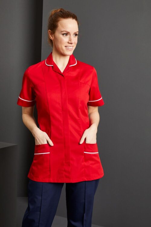 Pilkupüüdev naiste meditsiinituunika, kontrastsete detailidega. Liikumist võimaldav, külgedel tuulutusavad, reguleeritav vöökoht ja taskud.