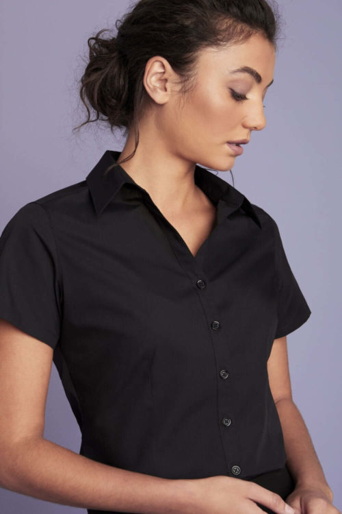 V-kaeluse ja lühikeste varrukatega must pluus naistele